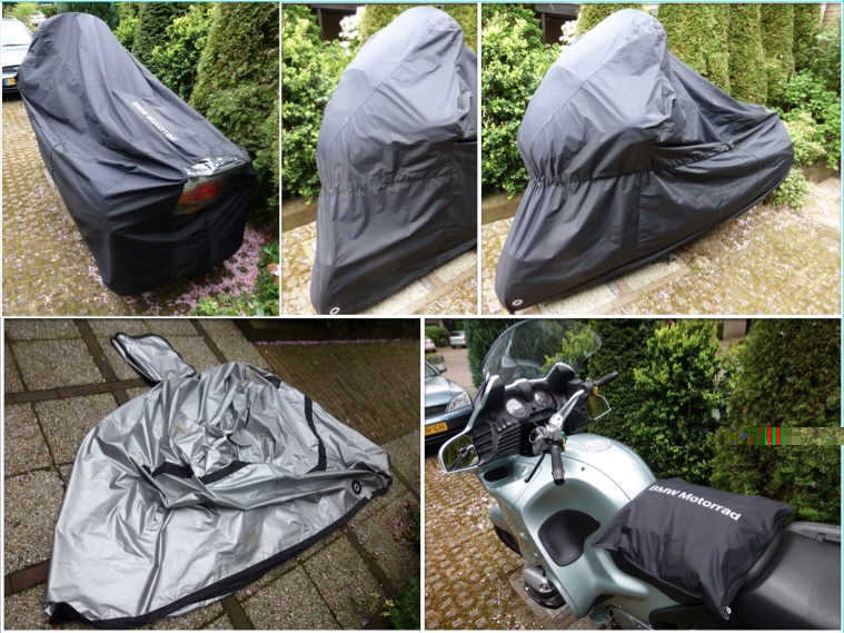 De stof van de hoes die ik meekreeg toen ik tweeënhalf jaar geleden mijn R1100RT kocht bleek grotendeels verteerd. Lang gezocht naar een alternatief (moest bestand zijn tegen weer, UV-straling, hitte aan de binnenzijde, mocht niet zo zwaar zijn, niet zo duur enz.). Uiteindelijk van http://www.bohling-eisele.bmw-motorrad.de een BWM Abdeckplane für verschiedene BMW Motorräder voor netto 79 Euro laten komen. De hoes voldoet aan al mijn eisen en is met ca. 1 kg ook nog lekker licht. Licht heeft het voordeel dat je zonder tegenzin elke dag de hoes eraf en erop doet. Hittebestendig heeft het voordeel dat je de motor niet eerst hoeft te laten afkoelen.