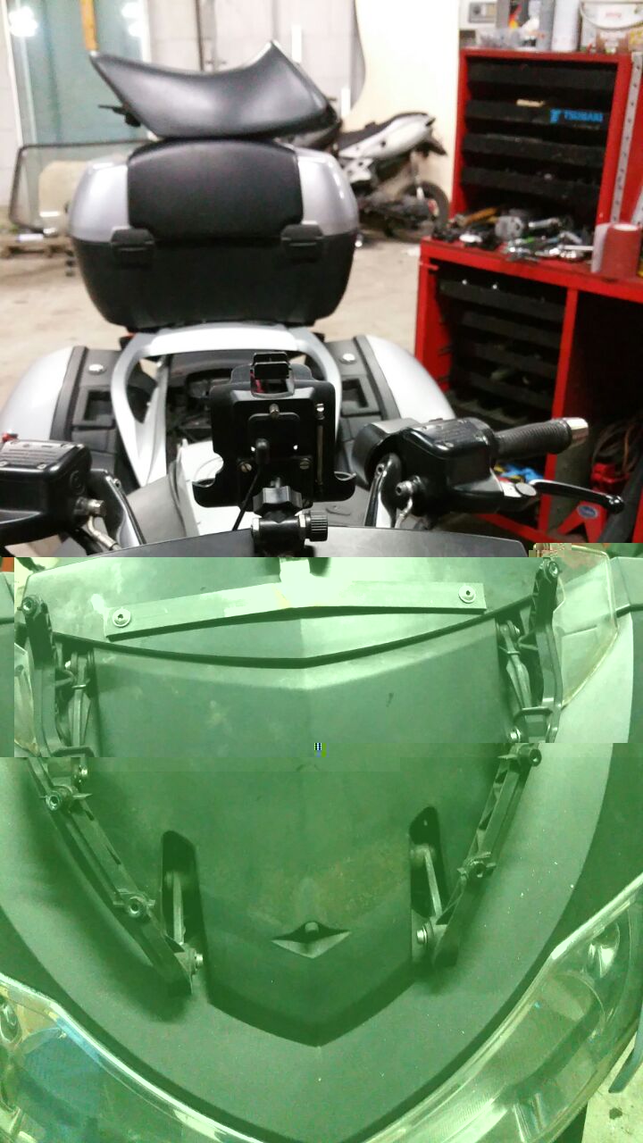 daarna heb ik op het kleine pootje van de T 2 opstaande plaatjes gemaakt en deze rond afgebraamd zodat ik hierop de steun van de Navi Kan bevestigen. Ik heb hiervoor de plastic houder voor in de auto gebruikt omdat ik de motor-steun veel te lomp vond (de navigatie krijgt achter de kuipruit toch niet veel mee van de rijwind).