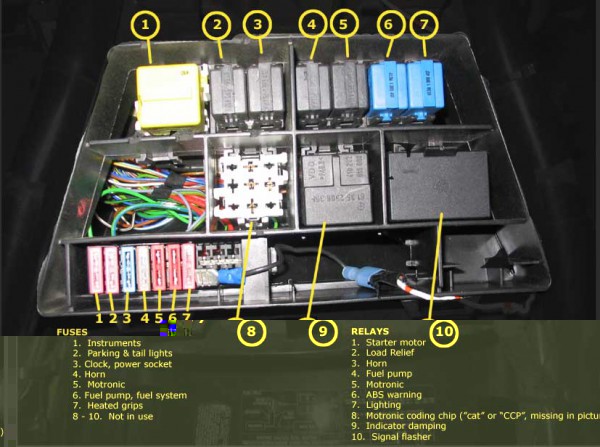 Om te controleren verwijder je de buddy seat zodat je bij je zekeringkast kan en het knipperlicht relais (nummer 10 op de foto). Neem vervolgens een multimeter en zet deze op de weerstand- (Ohm - Ω) of continuïteit-stand.