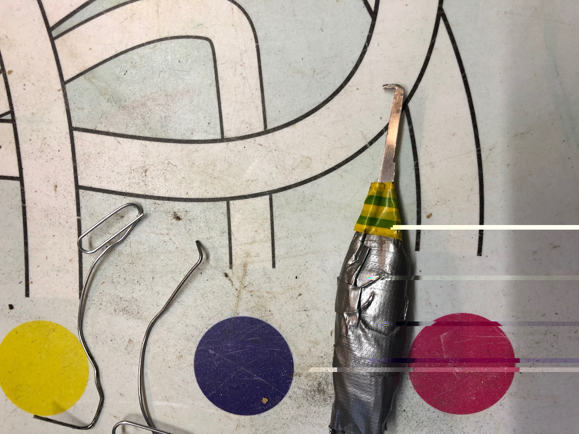 We hebben met twee personen zitten te peuteren, en we weten dat het sluitplaatje in de laatste sleuf zit. Met het instrumentje gaan we zover als mogelijk is in de cilinder, en schuiven dan langzaam op gevoel tegen de bovenkant (of onderkant) terug. We voelen dan het eerste sleufje en gaan daar op verschillende manieren in zitten peuteren. In principe moeten we het sluitplaatje tegen de zijkant opschuiven naar boven of onder...tja en dat hebben we afzonderlijk al enige tijd zitten doen, zonder resultaat dus...