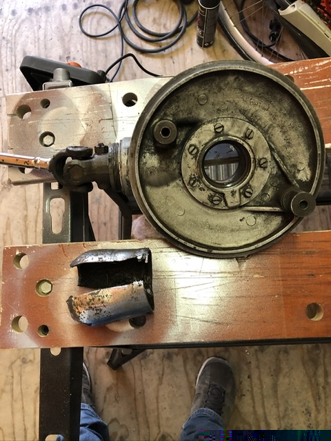 Ben maar eens aan de slag gegaan met de cardan as.hier zie je de oude as, nog vast aan het cardanhuis,