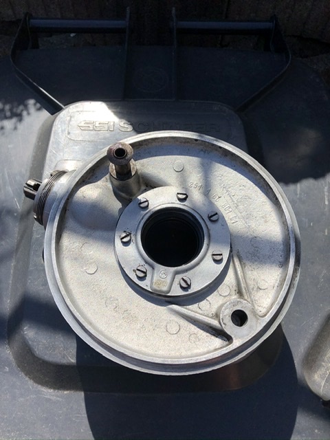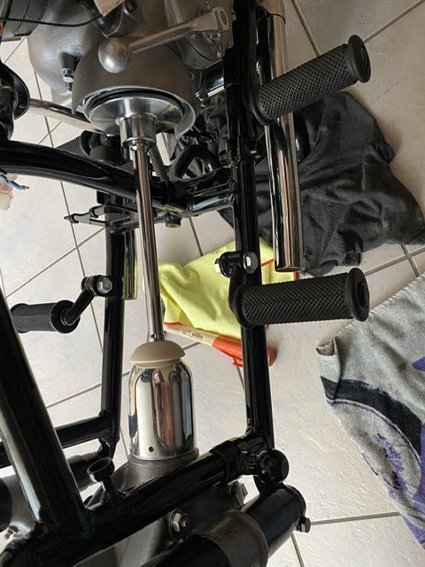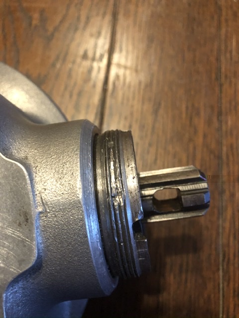 Om de as los te krijgen, moet de chromen “bell “ losgedraaid, maar deze is ooit mishandeld en doordat de schroefdraad