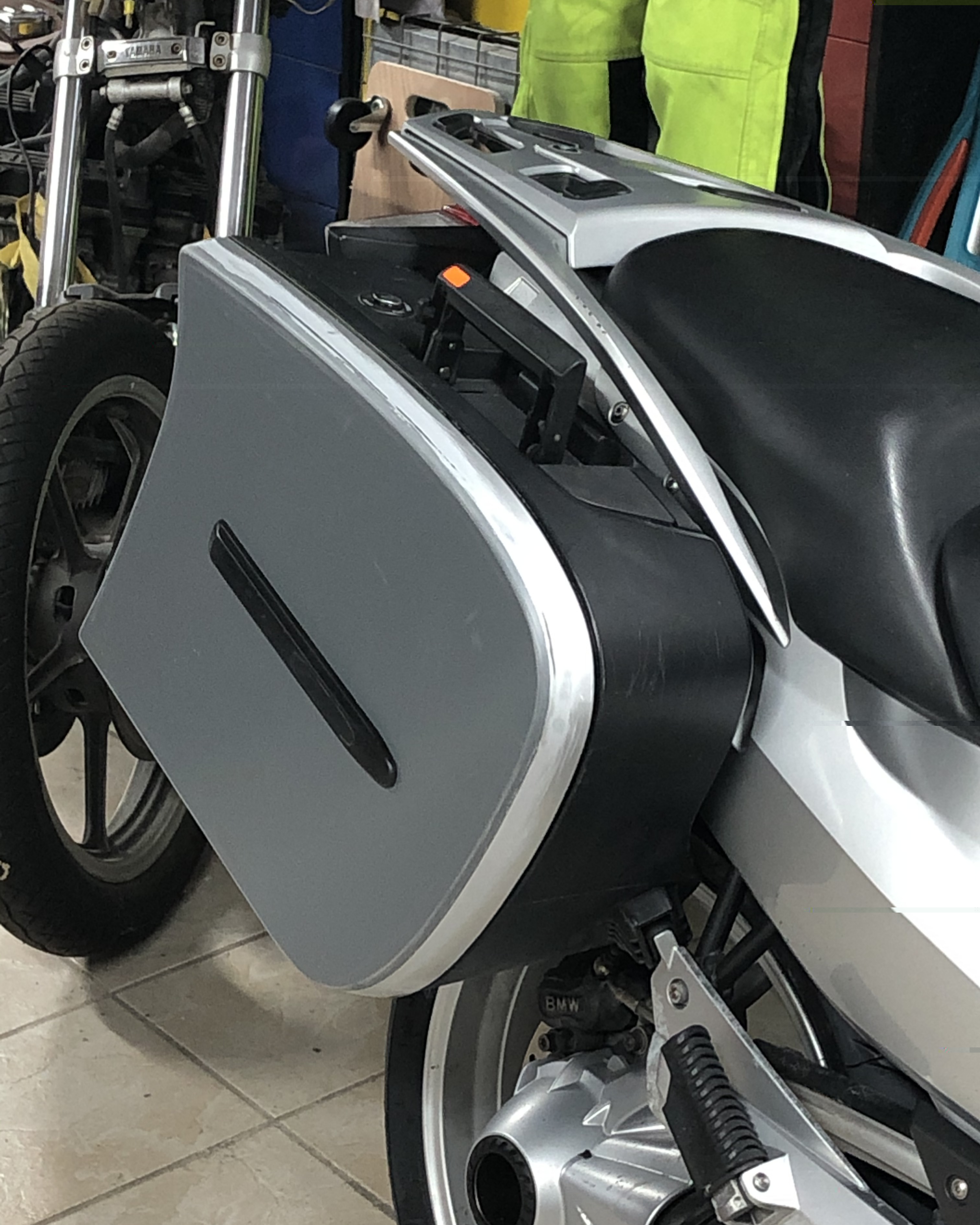 In 2006 kocht ik een R1200 RT en liep toen tegen het probleem van de breedte aan. De motor was met zijkoffers zo breed (breder dan de spiegels) dat hij niet door de poort kon zonder de koffers te verwijderen. Op dat moment bestonden er nog geen smalle (City) deksels. Ik heb toen de stoute schoenen aangetrokken en twee extra kofferdeksels besteld en daar de zaag ingezet en er zelf smalle deksels van gemaakt (zie de foto's). De inhoud van de koffers was vervolgens voldoende om mijn dagelijkse bagage en wat gereedschap mee te nemen. En als ik met (meerdaagse) vakantie ging kon ik gewoon de originele deksels er snel opzetten (de scharnieren zaten gewoon geschroefd).