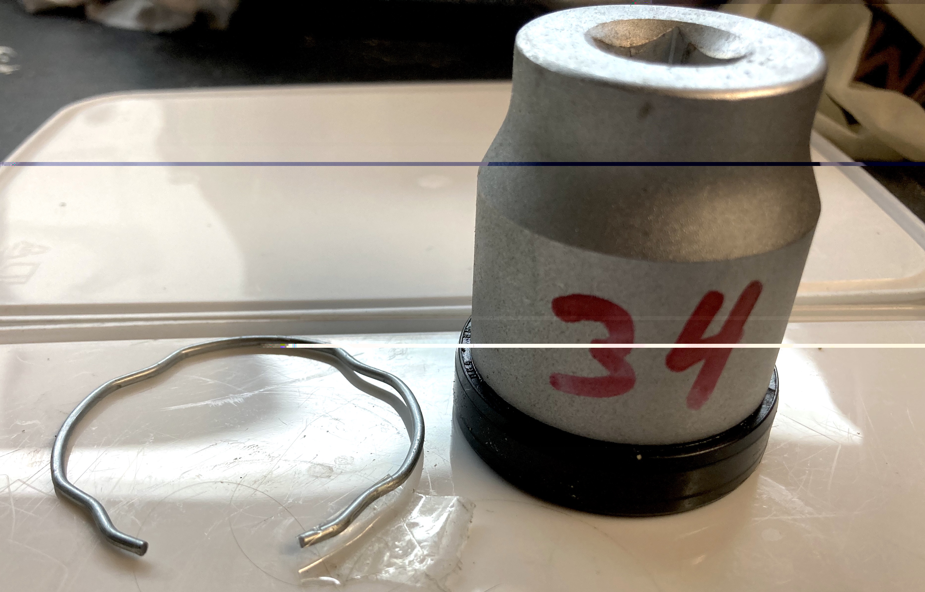Hierboven dopsleutel 34 waarmee de keerring recht in de onderste poot geduwd kan worden. Dopsleutel Nr 34 zit meestal niet in een standaard setje maar is ook handig bij het ronddraaien van de krukas bij de 1200RT bij bijv het kleppen stellen. Links de circlip die voorkomt dat de nieuwe keerring uit de onderste veerpoot omhoog kruipt. De stofkap houdt het stof weg maar niet de keerring op zijn plaats in de onderste veerpoot.