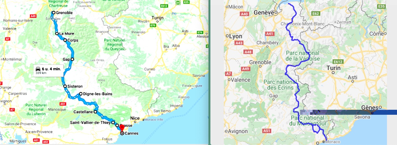 Links de Route Napoleon, rechts Route des Grandes Alpes.