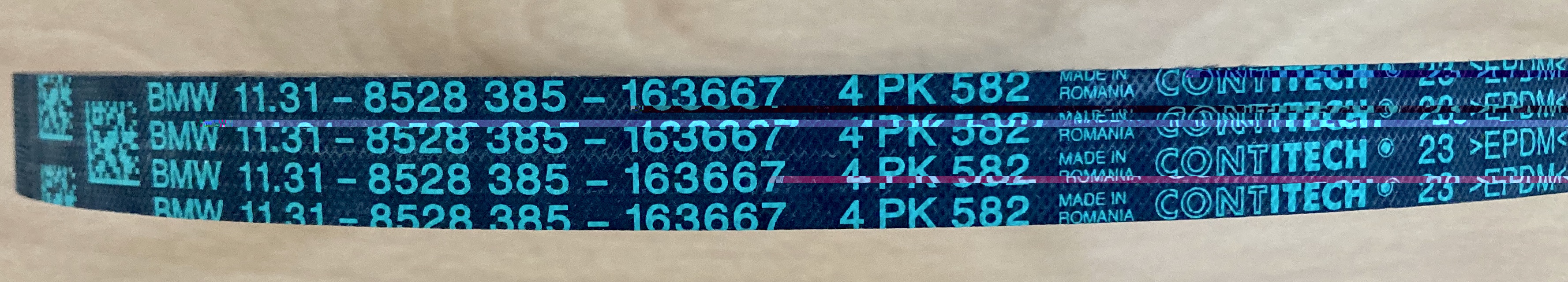 Nu is het wel zo dat mogelijk ter bescherming van de opdracht gever (BMW) de informatie op de snaar is aangepast. Dit om te voorkomen dat een slim iemand gaat zoeken naar een goedkoop alternatief. En die is er zeker. Ik denk dat de getoonde snaar dan de 4PK611 van Contitech zal zijn.