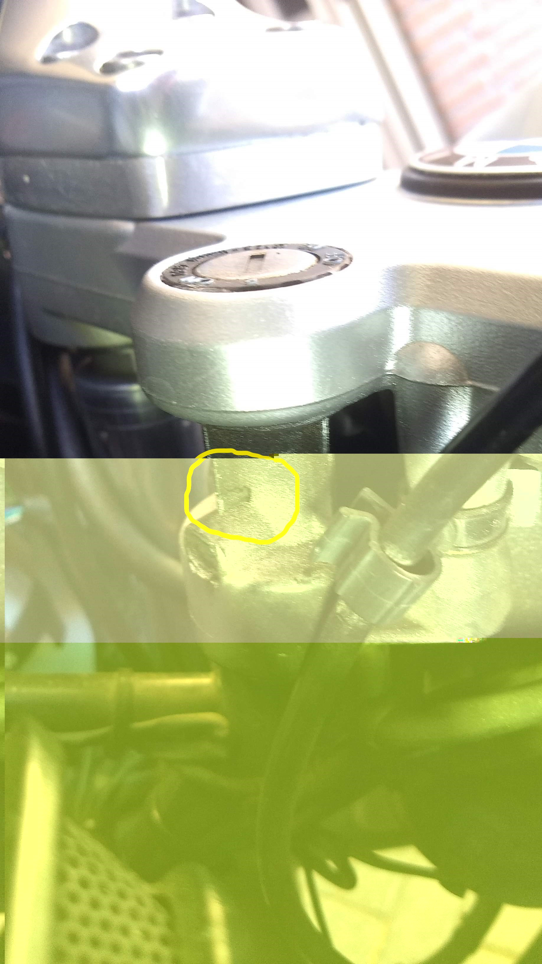 Bijna goed. Ik heb het stuurslot nog niet los gehad op basis van mijn topkoffer en kofferslot ervaring is het dit gaatje. Het zit 36mm vanaf de bovenplaat naar onder. Je hoeft er niets voor te demonteren. , zie bijlage van links af gezien.