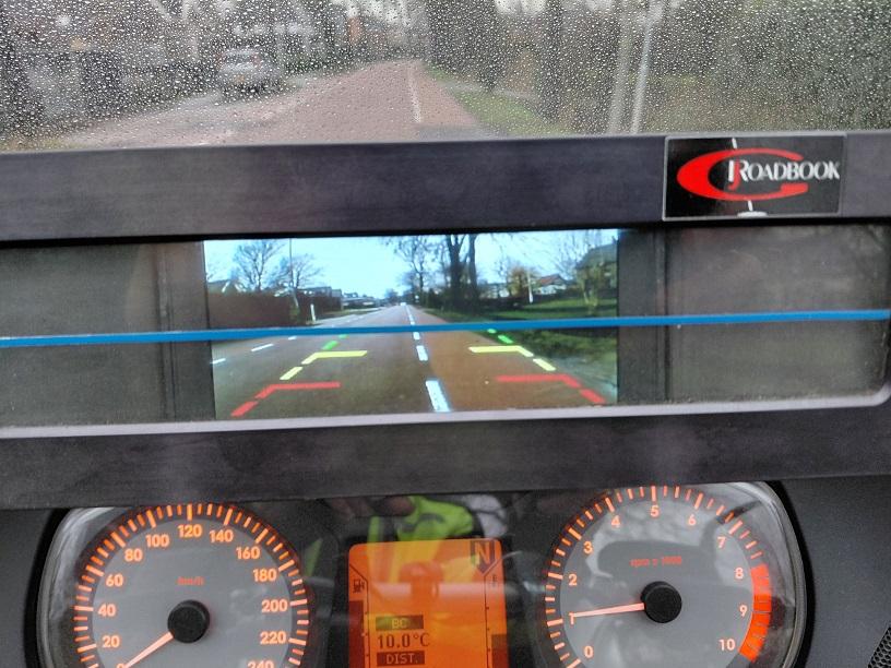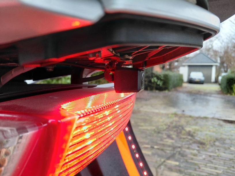 Dus in de routerol-houder heb ik een monitor gemonteerd en onder het bagagerek een (achtruitrij)camera (zit links en recht ook goed op het beeld wat je ziet).