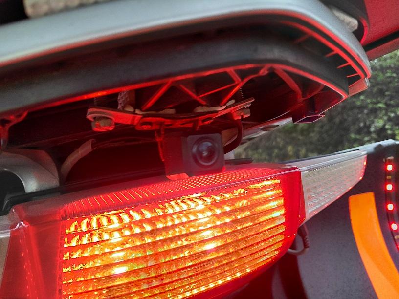 Het zou een mogelijkheid zijn om bij de originele topkoffer een L vormige steun (iets door de 90 graden buigen) te maken en deze achter de kentekenplaat te monteren. De camera komt dan als het ware tussen de kentekenplaat en de rode reflector te staan.