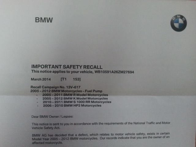 Meer belangrijker is een goede verstandhouding en relatie te hebben met een BMW dealeRT, die zal echt zijn best doen te zorgen dat je motor wat dat betreft veilig is. Als er nog iets aan moet gebeuren qau terugroepactie, zullen zij niet schromen.