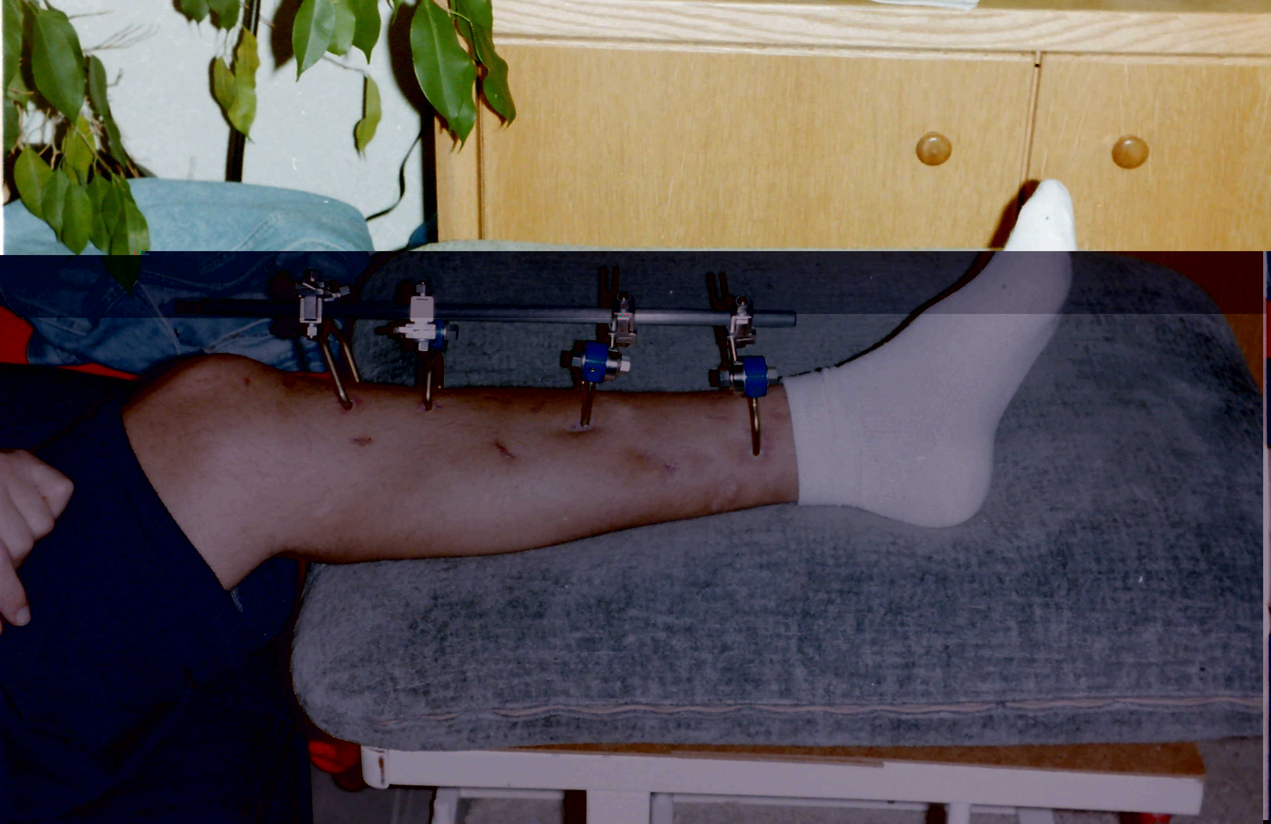 Zo zag mijn been er uit in 1996. Was niet mijn schuld en de chirurg zei dat ik zonder laarzen zeer waarschijnlijk geen voet meer zou hebben gehad omdat er dan een en ander had moeten worden geamputeerd.