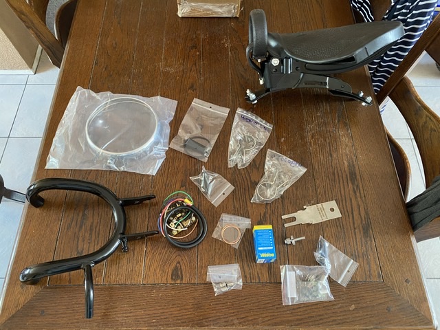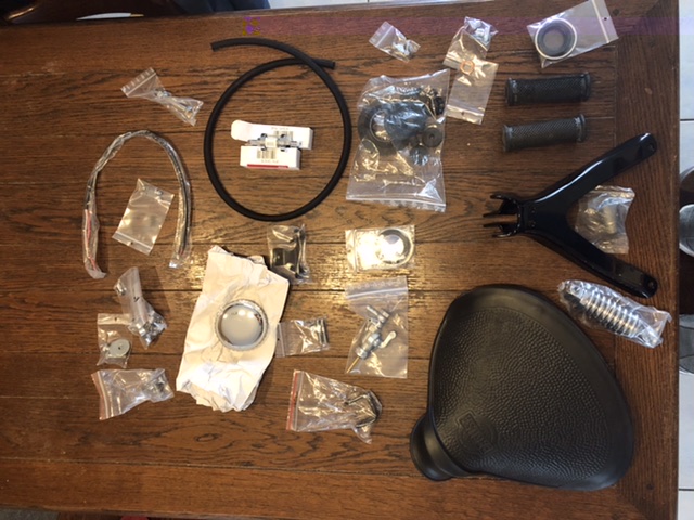 Rijderszadel, rubbers voor de voetsteunen, spulletjes om de tank te monteren .