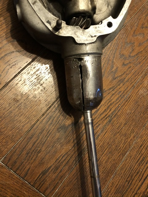 Ben maar eens aan de slag gegaan met de cardan as.hier zie je de oude as, nog vast aan het cardanhuis,