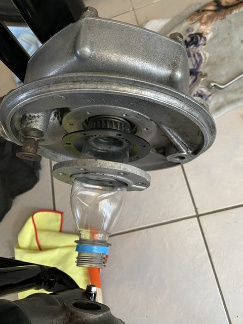 naast de nieuwe. Om de as los te krijgen, moet de chromen “bell “ losgedraaid, maar deze is ooit mishandeld en doordat de schroefdraad