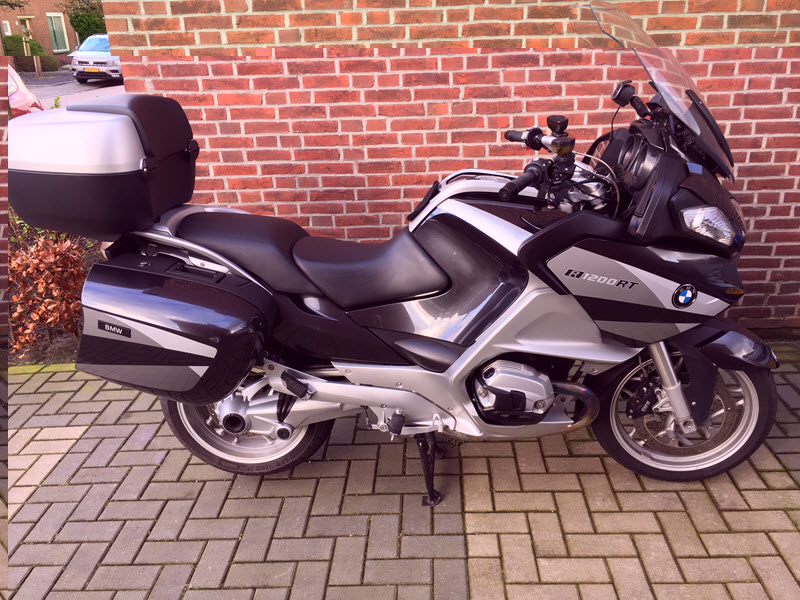 R1200RT DOHC bwjr 2011, in oktober 2012 pas op kenteken, 49K op de telleRT, 2 "Vorbesitzer", met ESA en ASC, boordcomputer, radio (vandaag geprobeerd, ik vind het niks) en cruisecontrol (ik vind een TravelLock van Harry "TravelRoad" Tonk tòch fijner)