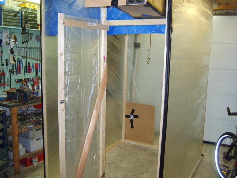 Omdat mijn garage inmiddels zeer stoffig is geworden ben ik maar meteen begonnen met het bouwen van een huis/tuin en keuken spuitcabine. Bij de bouwmarkt een pakketje vuren latten gehaald en daarmee een frame en een deur in elkaar geknutseld. Met een beetje mazzel kan ik op eenvoudige wijze mijn garageheater en een afzuiger op de cabine aansluiten.