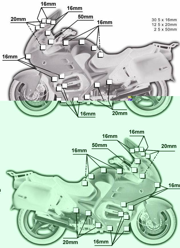 Afbeelding van de diverse boutjes qua lengte & draad op de 1150RT;