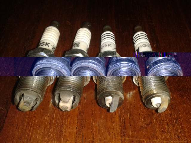 De dame heeft er 112.000 km op zitten. Niet meer zo piep dus, maar nog wel kwiek. Het luchtfilter heb ik bekeken en schoongemaakt, was niet echt vies. Het verbruik puur alleen bij snelweggebruik zou ik niet weten, de rondjes die ik maak zijn buitenaf, meestal 80 km wegen. Rijden op de snelweg is niet mijn hobby. Ik heb een paar foto's bijgevoegd van de oude Brisks en de NGK's die ik er net even uitgedraaid heb. Er is een kleurverschil te zien tussen de linker- en rechter bougie. Rechts heeft een wat meer koffiebruine kleur, links is iets donkerder. Ook tussen de Brisks zit wat verschil, ik weet alleen niet meer welke bougie in welke cylinder zat.