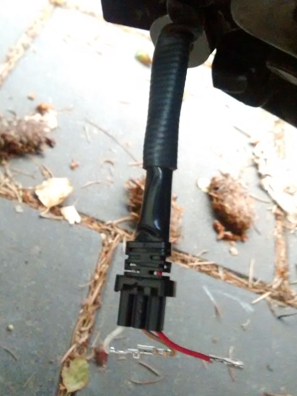 Ik heb uiteindelijk alles in takt gehouden voor eventueel hergebruik en alleen schroevendraaier nodig gehad om de connector er uit te wippen, stuk tape om af te plakken en tyrap om connector kabel weer vast te klemmen. Als je de kabelhoes voldoende omhoog schuift komt de connector helemaal vrij en kun je de 3 pennen uit de connector verder doorduwen (rode zou je ook op de plaats kunnen laten zitten) (1e foto) en daarna de witte en bruine met elkaar verbinden (2e foto):