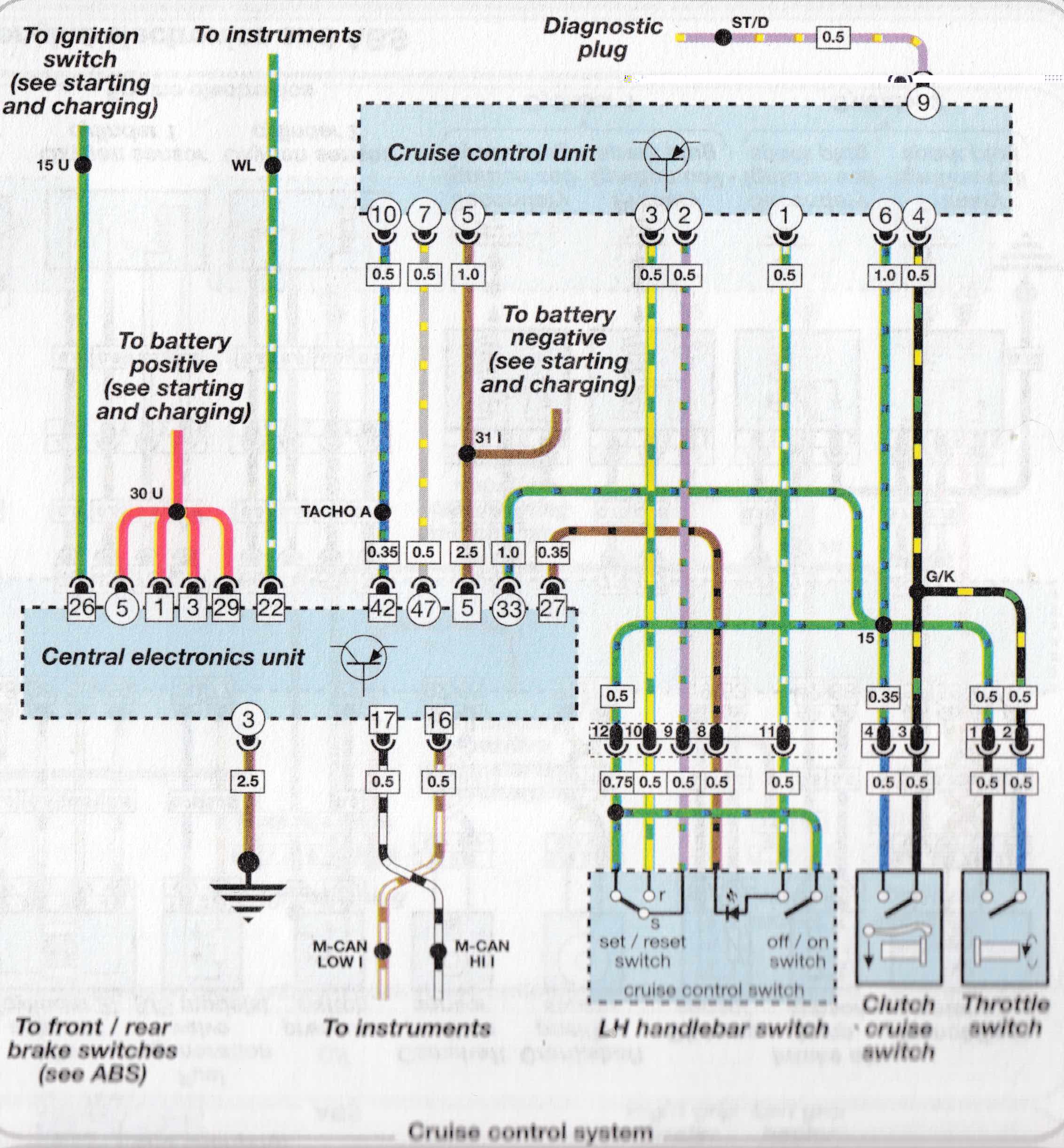 De Cruise Control Unit (10-polige connector zo te zien op het schema) is verbonden met 2 draden (plus een 3e, massa) met de Centrale Elektronica Unit (ZFE, het brein van de 1200RT), dus inderdaad (wederom) CAN-bus.