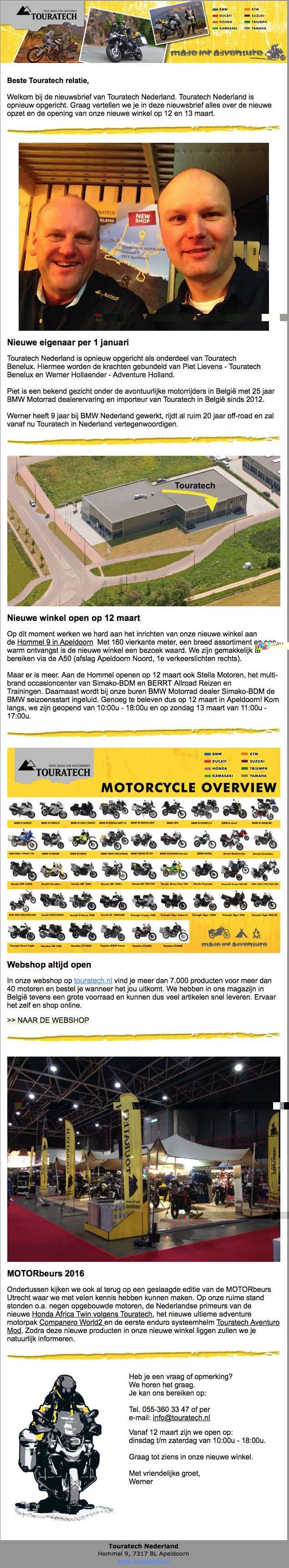 Welkom bij de nieuwsbrief van Touratech Nederland. Touratech Nederland is opnieuw opgericht. Graag vertellen we je in deze nieuwsbrief alles over de nieuwe opzet en de opening van onze nieuwe winkel op 12 en 13 maart.
