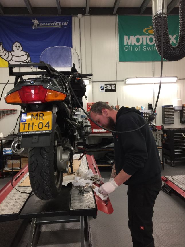 Terwijl ze bezig waren lichtte Kenny mij in mbt de bevindingen. Gelukkig was er niks drastisch en tijdens het gesprek zijn we overeen gekomen dat ze gelijk een 0-beurt konden verrichten. Dit was denk ik het meest logische want het Tupperware was er af en ik zou niet nog een keer terug hoeven voor deze beurt. Het enige wat mis was was dat de remvloeistof zwart was ipv mooi helder. Dit terwijl, de verkoper, daar waar ik de motor heb aangeschaft, mij vertelde dat het remsysteem onderhanden was genomen. Zelfs het onderhoudsboekje was afgestempeld en ondertekend. Beetje jammer. Kortom, laat je niet van de wijs brengen door mooie praatjes.