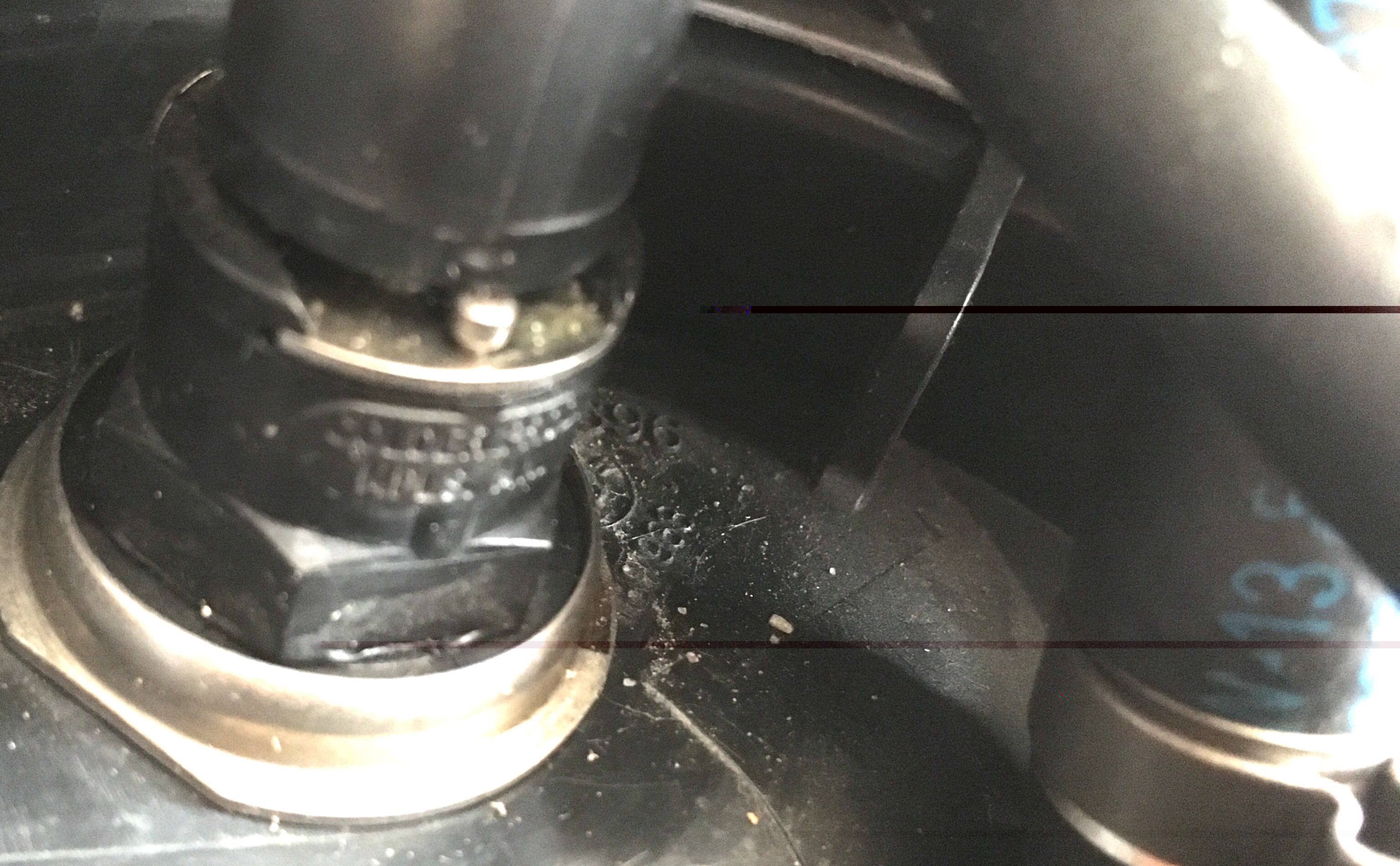 Als ik nu het contact aanzet start de benzinepomp en zie ik meteen benzine rondom die metalen ring verschijnen... :-(