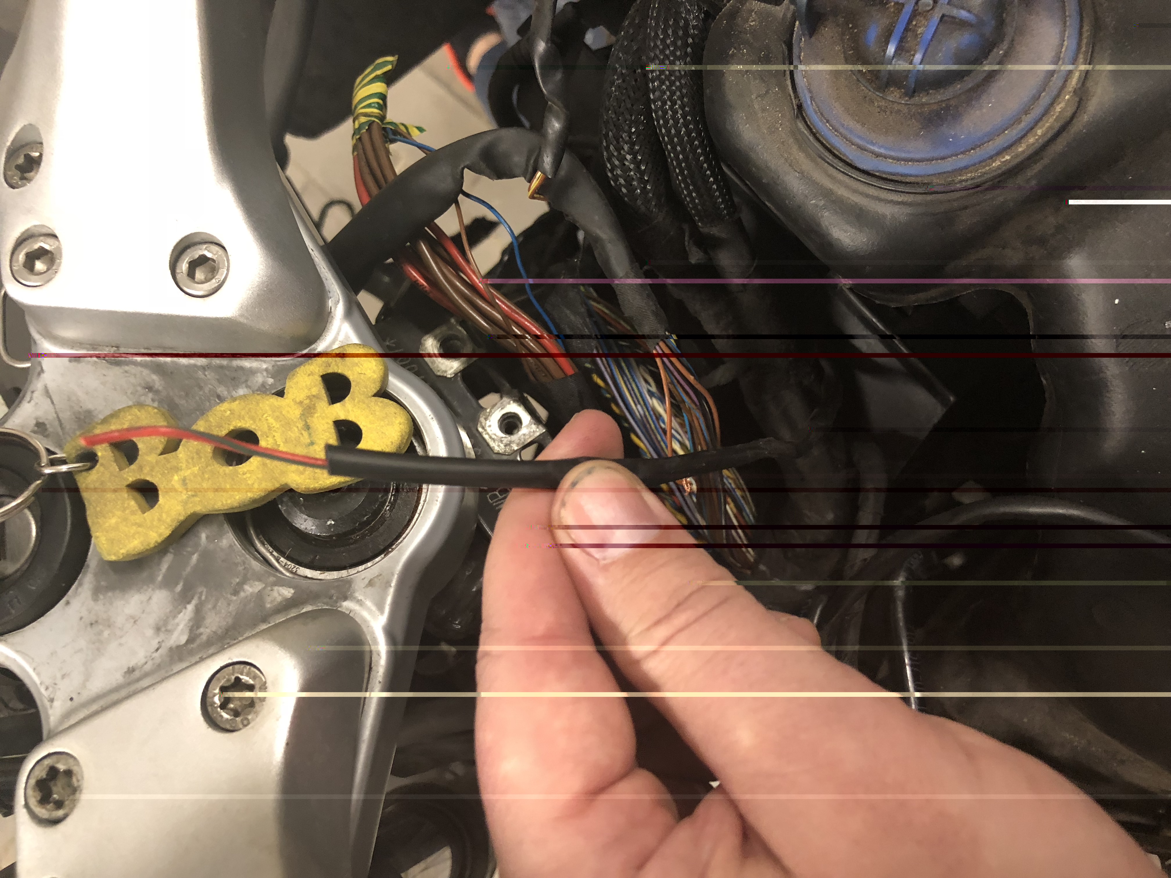 1) Een bosje bruine en rode kabels (zie foto) die bij de tweede accu vandaan kwamen en ter hoogte van het stuur de kabelboom ingaan. Daar staat spanning op. Ik heb ze afgeplakt, maar je zou ook de gehele boom van tapen kunnen ontdoen en ze weghalen. Deze gaan naar de eerste accu onder het zadel. Als alternatief kan je er een apart 12 volt circuit van maken. Ik geloof dat Nico dat gedaan heeft.