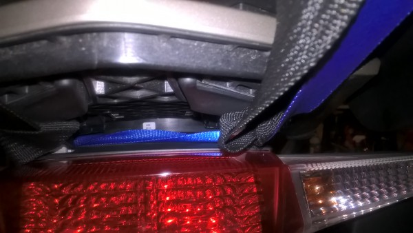 Topkoffer had ik al "bekleed" met 3M folie van een 300µm dik. Naast bescherming van de laklag geeft dit meteen ook extra wrijving tov bodem drybag. Omdat de Drybag 350 erg groot is, verdeelt deze zich bij het aantrekken over het gehele topkoffer oppervlakte, en de hoogte blijft beperkt tot een schoenhoogte hoog en beweegt geen mm.
