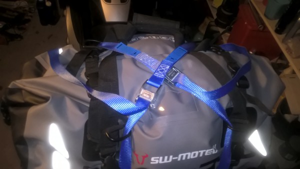 De originele 4 stuks drybag banden hebben een lus die ik om de duohandgreep en de topkofferplaatbevestiging heb vastgezet.