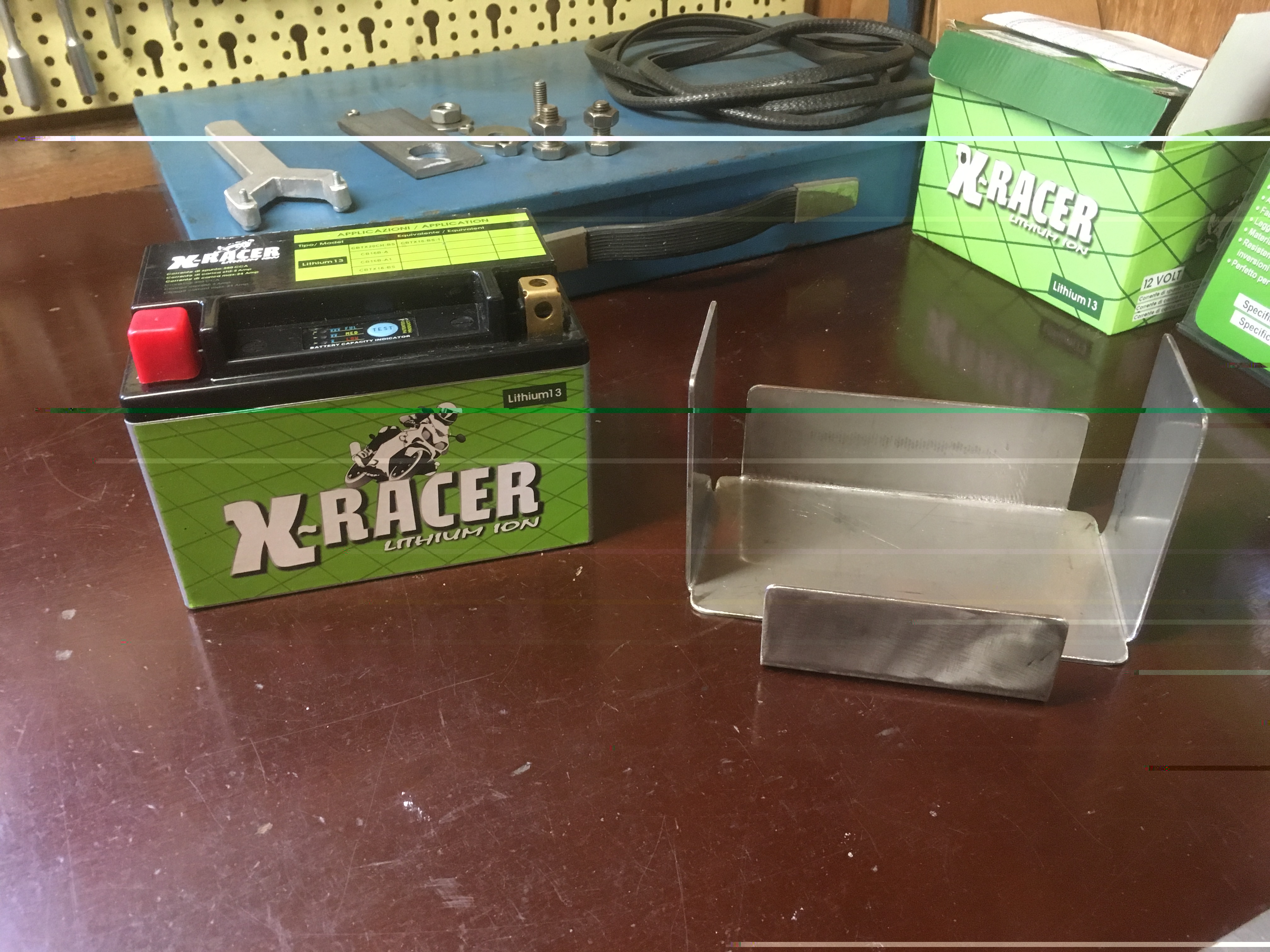 M.unit gekocht bij Motogadget en een lithium accu voor onderbouw achter motor carter. Hiervoor nieuw accubakje van RVS gemaakt.