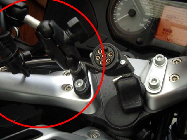 Toen ik nog een R1200RT had, was ik nog in het bezit van zo'n grote Streetpilot 2610 met speciale houder. IK heb deze toen met een Ram Mount op het stuur bevestigd. De kogel hiervoor had ik met verlengde bouten op de plek waar de stuurhelft aan het frame zat bevestigd.