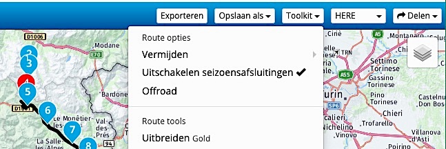 In de Here kaart, zoals die o.a. gebruikt wordt in de Garmin/Zumo navs, bestaat de mogelijkheid om seizoensafsluitingen te omzeilen door de optie ‘uitschakelen seizoensafsluitingen’ aan te vinken. Veel routes voor de zomer worden juist in de winterperiode gemaakt en dan biedt het gebruik van deze optie een goed alternatief om de route af te maken. Het zou wat ver voeren om de route pas af te kunnen maken nadat de sneeuw weggesmolten is.