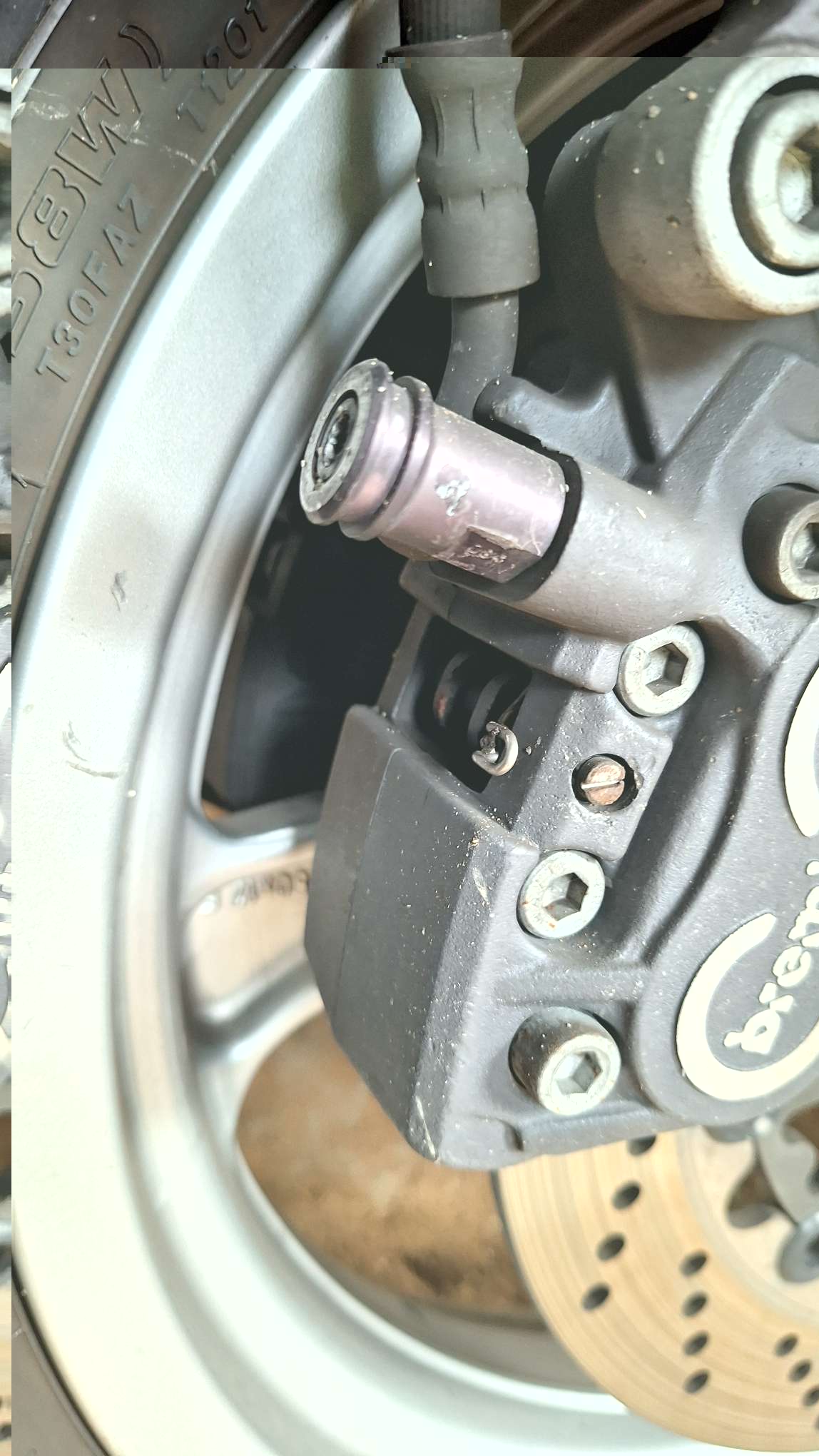 Op de remklauw aan de andere kant (links voor) zit wel een gewone ontluchtingsnippel.
