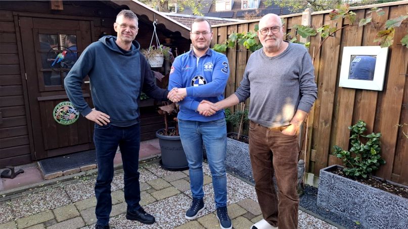 Jos (R) en Eilert (L) bezegelen de overname van het forum aan Patrick (M) met een ferme handdruk