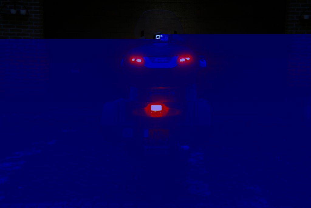 Tussen die overgangen gaat het mis. Als je maar iets hobbels hebt, dan knippert je remlicht mee. De reflectoren zitten standaard in de koffer. die kan je gebruiken voor je zelfbouw project. Ik heb bovenin gele 3mm ledjes gelijmd. onder heb ik zes gaatjes geboort en 5 mm rode leds gelijmd. dat zijn 0.5 Watt types. Die heb ik via een weerstands netwerkje, twee aan twee, aangesloten op zowel het achterlicht signaal als ook op het remlicht signaal. De uiteindelijke aansluiting heb ik in het achterlicht bij de bestaande bedrading gesoldeerd. Daar heb ik nog twee dioden gezet tussen het achterlicht signaal en het remlicht signaal. Dan kunnen die elkaar niet beïnvloeden.