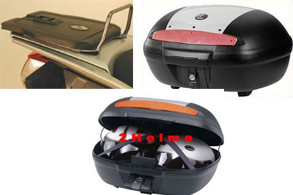 Ik adviseer de originele kleine topkoffer.Dit merk ik al als deze gemonteerd zit qua stabiliteit op de snelweg.Ik wil hiermee zeggen dat de grotere maten dit alleen maar versterken en het rechtuitrijden erger beinvloeden.Verders lijkt me de originele bevestiging beter/degelijker omdat er geen tussenplaat gebruikt wordt.Het is mijn advies,kiezen doe je zelf!