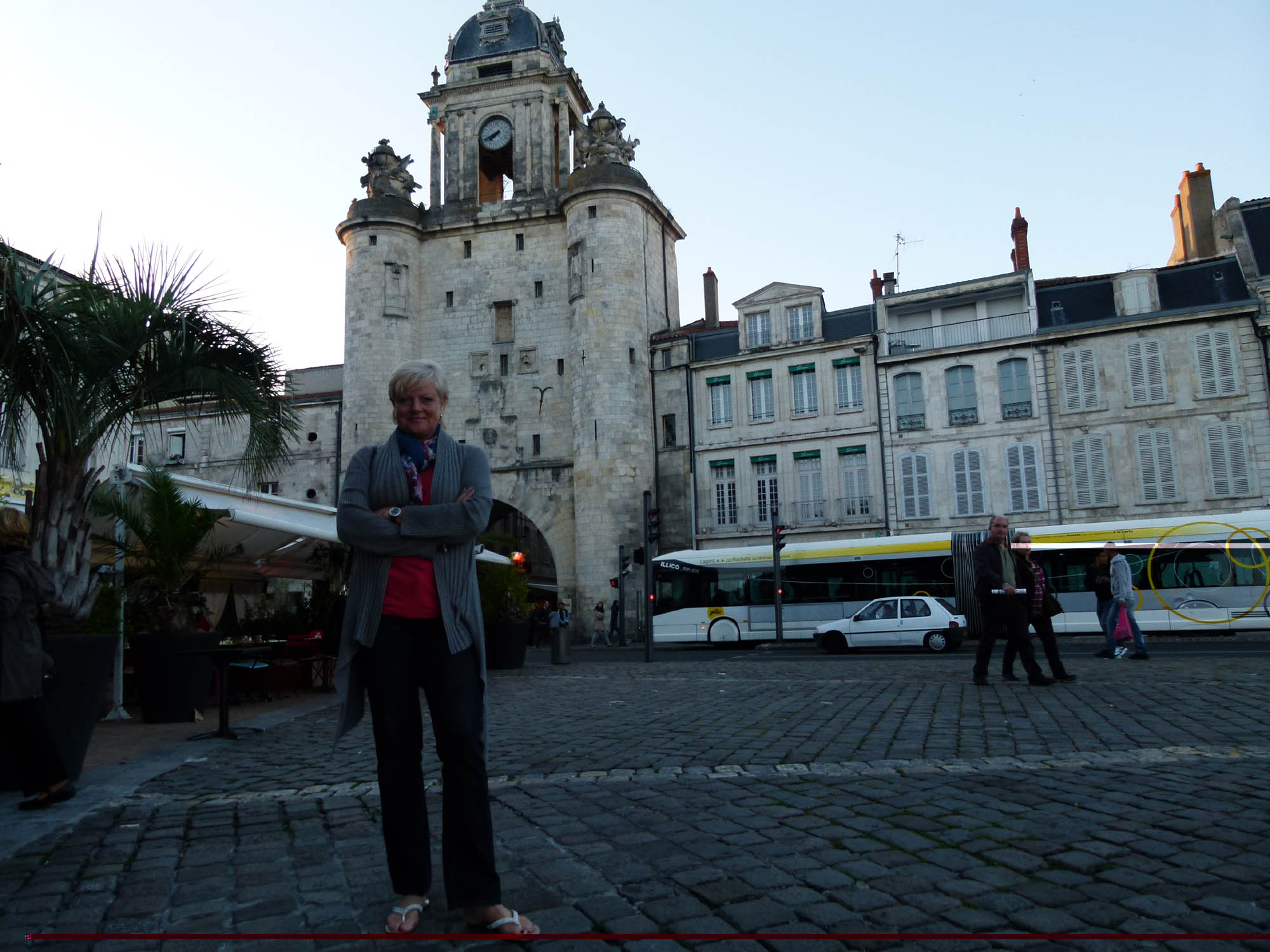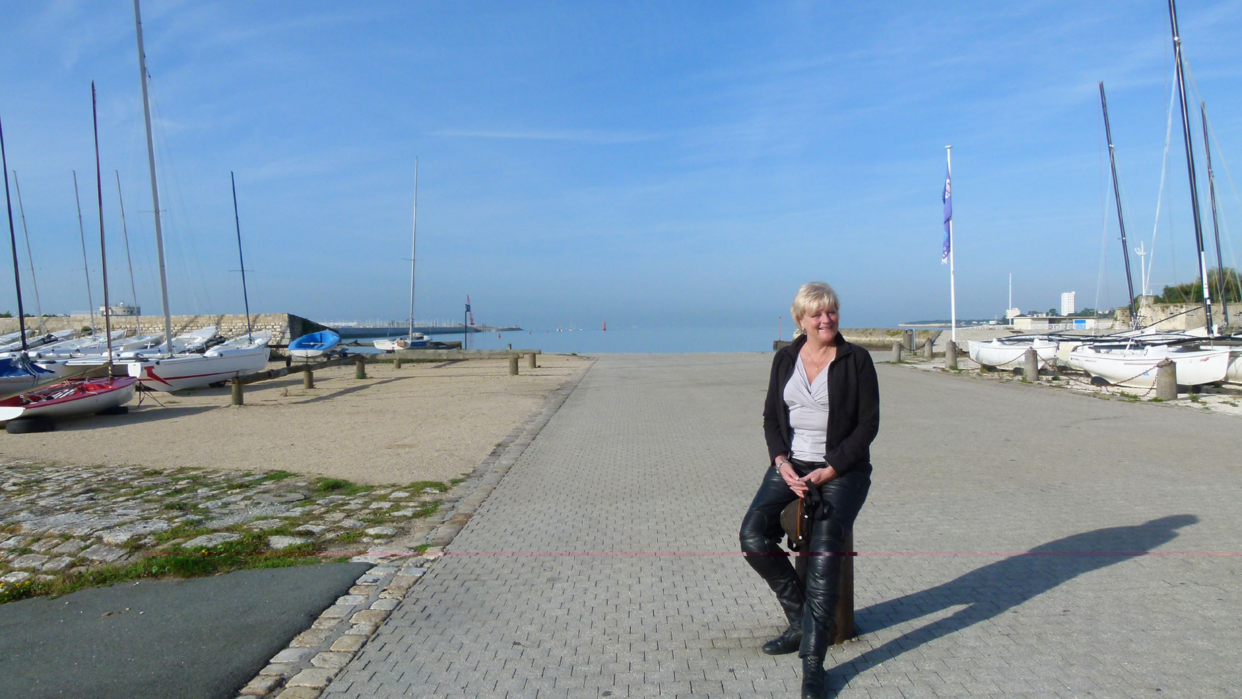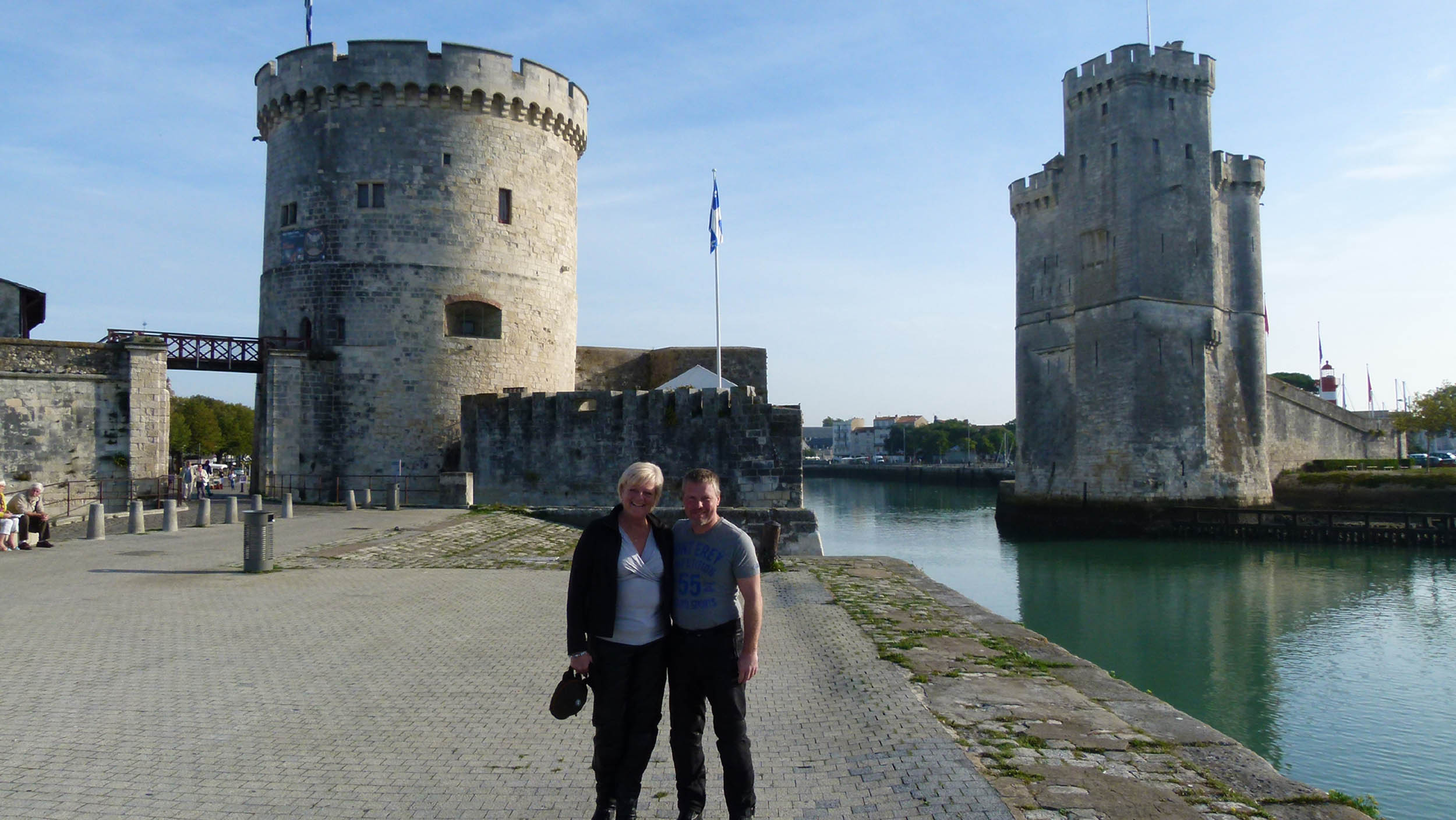 Het einde van de week nadert stilaan en we richten onze neus naar het meer noordelijke La Rochelle. Chrisje heeft vernomen dat het een mooi stadje is en wil er graag heen. We laten Bernard terug een kronkelroute uitstippelen en zien wel waar die ons brengt. La Rochelle zelf lijkt me wat ver kronkelen, misschien vinden we wel een leuke herberg onderweg. Eens we Pau voorbij zijn duiken we terug tussen de immense velden van Gascogne (je weet wel, D’Artagnan) met zijn lieflijke maar meestal verlaten dorpjes. We hebben de indruk dat er in de week op het Franse platteland niemand thuis is. Het begint te miezeren en voor we het weten zitten we in een serieuze plensbui. De lederen pakken zijn eigelijk al te nat maar we trekken toch maar onze regenkledij aan. De natte wegen met dikwijls veel modder van landbouwvoertuigen vind ik niet meer aantrekkelijk. Bernard toont me snel een route naar La Rochelle via grotere wegen. Na een uurtje of zo wordt het dan inderdaad droger. We stoppen in een plaatselijke kroeg waar de baas me al snel een zelfgebrouwen aperitief onder de neus duwt, Chrisje die redelijk verkleumd is bestelt, ondanks zijn protest, een tas thee. Omdat de Fransen nu eenmaal hun hoofdmaaltijd ’s middags eten rekent hij er blijkbaar op dat we blijven lunchen. Wij hebben echter nog helemaal geen honger en vragen de rekening. Hij kan zijn ongenoegen moeilijk verbergen. Terug de weg op dan maar en het gaat vlot op de steeds drogere wegen. Als de zon doorbreekt, trekken we de regenkledij uit om het leder verder te laten drogen. Rond 14 u zien we een terrasje in de zon. We vragen een slaatje en iets om te drinken en la madame meldt ons dat we enkel de volledige plat kunnen krijgen. Voorgerecht en hoofdgerecht kunnen niet apart besteld worden. Ik zeg haar dat we ’s middags andere eetgewoonten hebben in België en bestel 1 plat voor ons beiden. Ik neem het hoofdgerecht en Chrisje het voorgerecht. Deze Française blijkt nu ook een beetje boos. Tja, ’t is niet anders. We checken Bernard en stellen vast dat we rond 18 u in La Rochelle kunnen zijn. We boeken een hotelletje in de haven dat vermeld werd in de gids. Dit blijkt de minst mooie kamer te zijn van de hele week. De RT sleutelhanger wappert op de kaai van La Rochelle. Het stadje zelf is wel zeer mooi en we eten een lekker dinertje begeleid door live piano in de haven waarna we nog een kleine wandeling maken door de achterliggende straten. We sluiten de avond af met wat oude afleveringen van CSI.
