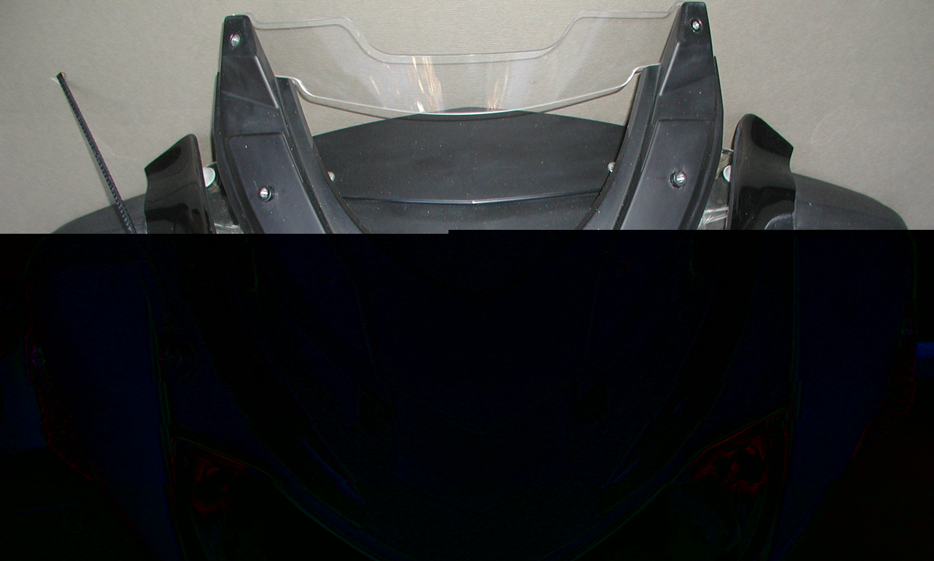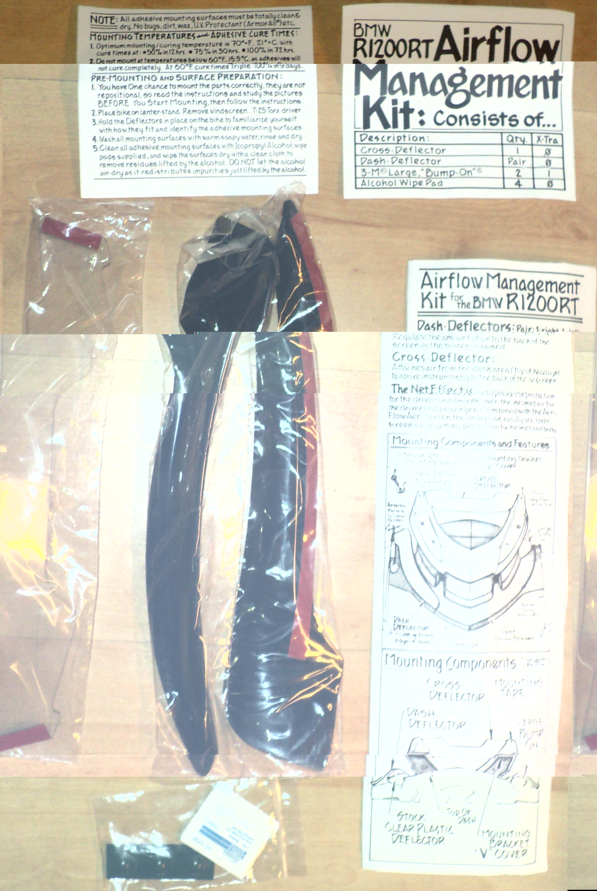 (en de herontworpen neus van de 2010 1200RT, schat ik zo in)De "Airflow-kit" bestaat uit 3 deflectors. De Airflow-kit voorkomt de luchtstroom van het "doorslaan" onder het scherm door en het raken van het lichaam van de bestuurder als het scherm wordt verhoogd. De derde deflector dwingt de luchtstroom van het dashboardgebied naar de achterkant van het scherm. De luchtstroom aan beide zijden van het scherm worden gecombineerd, waardoor de luchtstroom naar de bovenkant van het scherm gladgestreken en zo turbulentie wordt voorkomen. De luchtstroom Kit is niet vereist voor de 2010 R1200RT als gevolg van veranderingen in de BMW OEM ruitverstelmechanisme-afdekframe.
